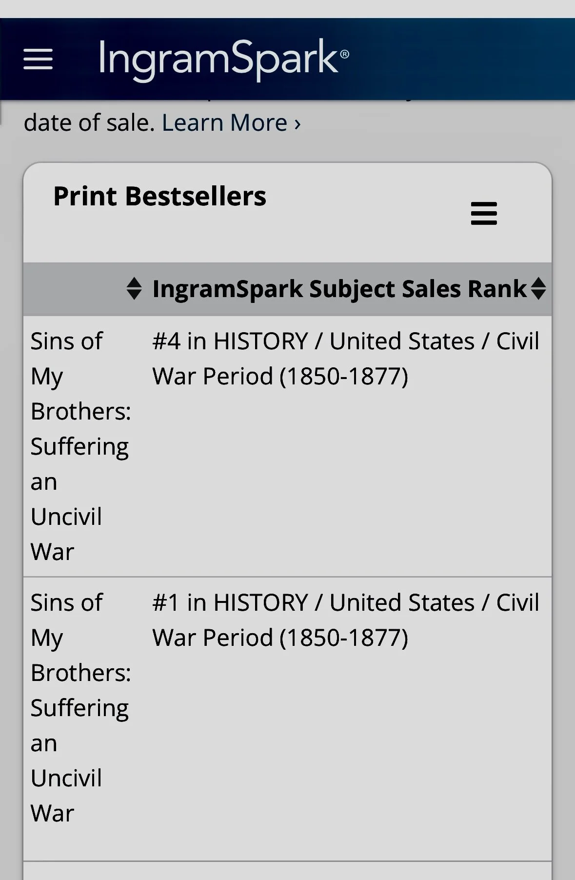 SINS OF MY BROTHERS was ranked #1 in sales for Civil War Period